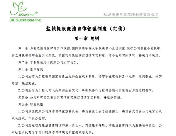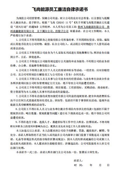 江西飞尚林产无限公司、盐城捷康三氯蔗糖制作无限公司在成立健全本企业《清廉自律办理轨制》的底子上,连系企业现实,制定了从勾当计划到勾当内容清单等的一系列轨制系统。贵州飞尚动力无限公司还订定了《员工清廉自律许诺书》,由许诺人具名并交地点部分和公司各执一份。