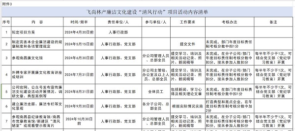 为凸起轨制扶植重点,夸大可操纵性、可遵守性和分歧性,实在阐扬轨制的标准功效,团体总裁办公室提早订定《飞尚团体清廉自律办理轨制》《飞尚团体清廉文明扶植“清风步履”名目勾当内容清单》,并与《告诉》一道宣布,明白勾当目标、任务准绳、勾当内容、相干请求等。同时,请求各成员企业从现实动身,量力而为,务求实效,对峙大众线路,增夸大查研讨,有针对性成立健全清廉任务轨制,增强轨制的可操纵性和合用性。